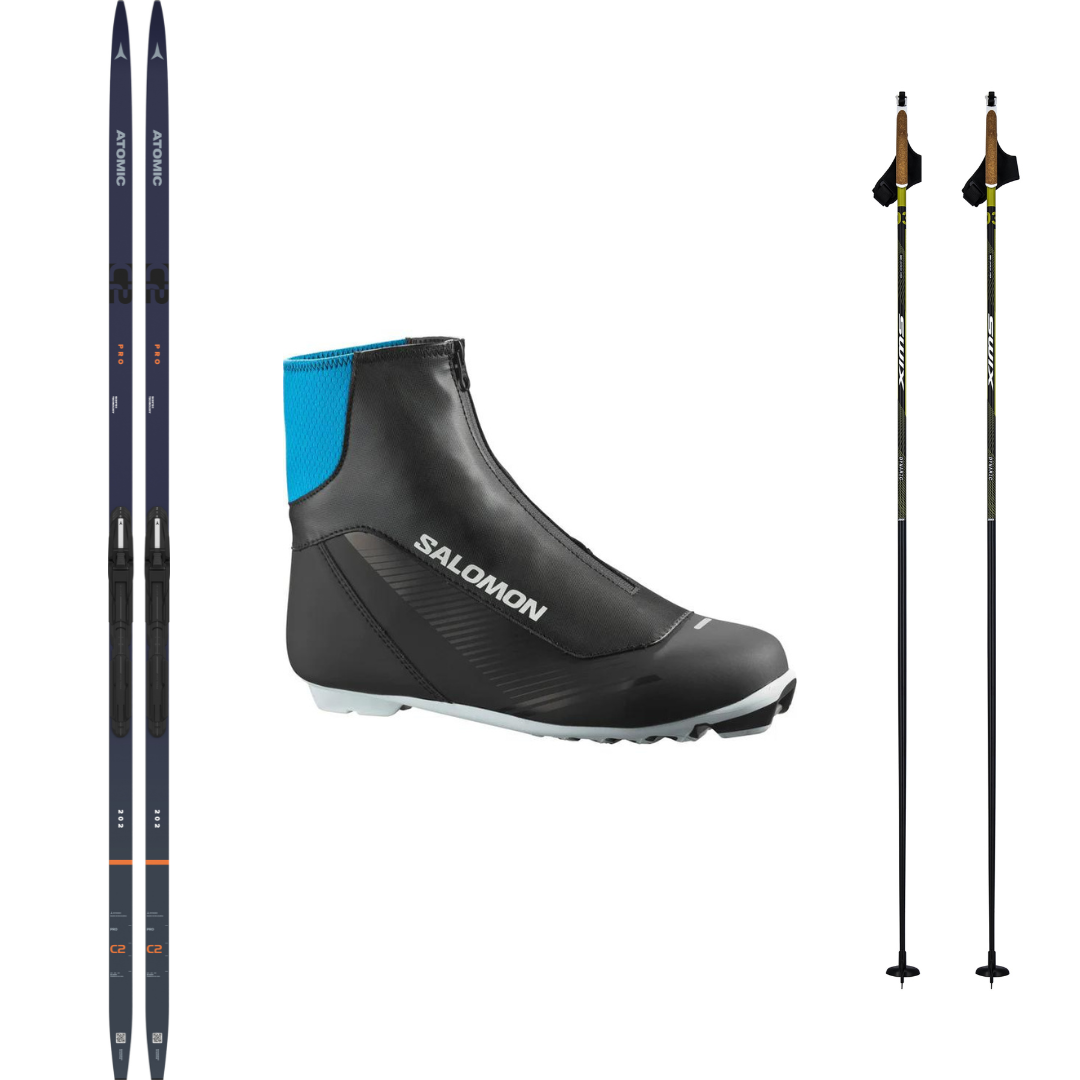 Ski: The Atomic Pro C2 eSkin is a great beginner-friendly ski that is perfect for getting the performance of a classic ski without worrying about kick wax. This is a great ski to learn on or upgrade to from a fish scale for a more efficient ride.